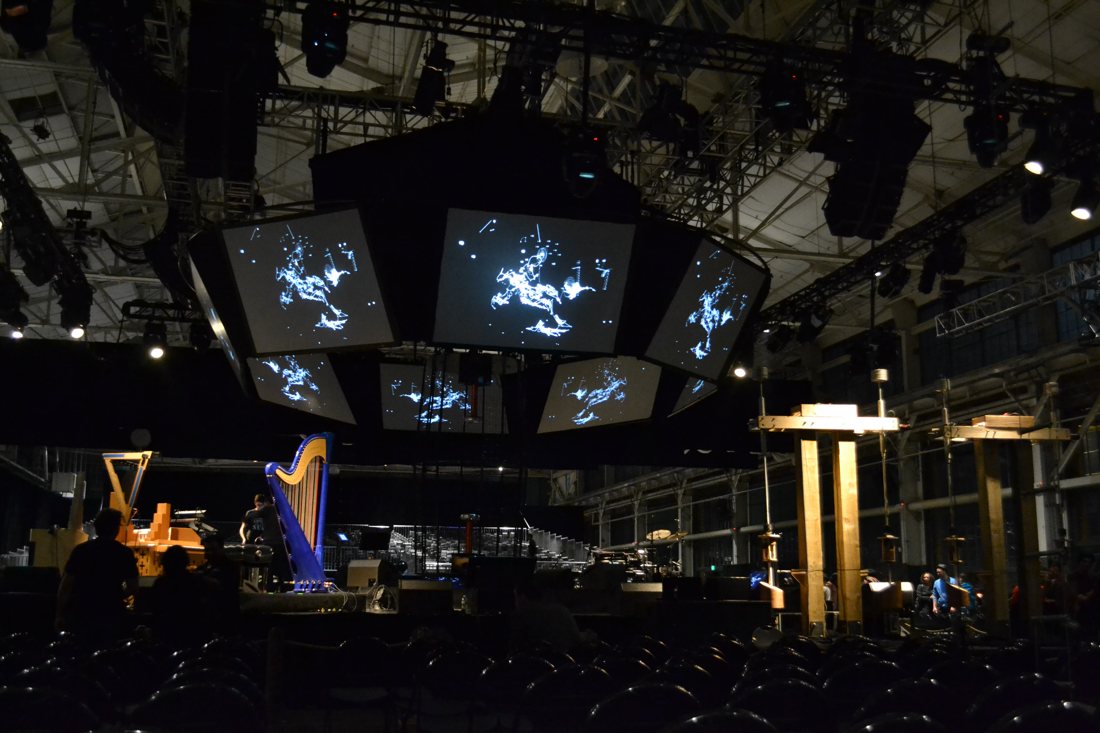 Meanwhile, we stood in line with digital artists, punk kids from Sacramento, and yuppie parents from Oakland. Once inside, we found a spot standing ten metres away from a small stage surrounded on all sides by fellow eccentrics, creators, and dreamers. The lights dimmed, a ring of screens lit up with videos introduced by nature documentarian David Attenborough, and a cage of tesla coils descended from the ceiling to join the enormous pendulum harps, drums, and pipe organ on stage. That’s when Björk herself came out with ruby platform shoes, a frizzed-out blue and orange wig, and a choir in tow to teach us this: